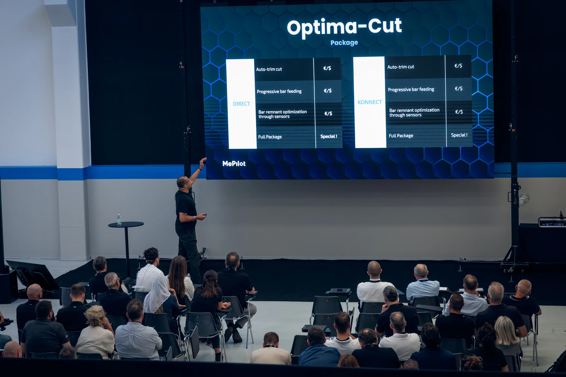 Accanto al palco è stata allestita un’area per le demo live delle segatrici MEP. Le telecamere hanno trasmesso le lavorazioni in tempo reale al ledwall, permettendo al pubblico di seguire le dimostrazioni in modo immersivo e trasformando il prodotto nel protagonista dell’evento.